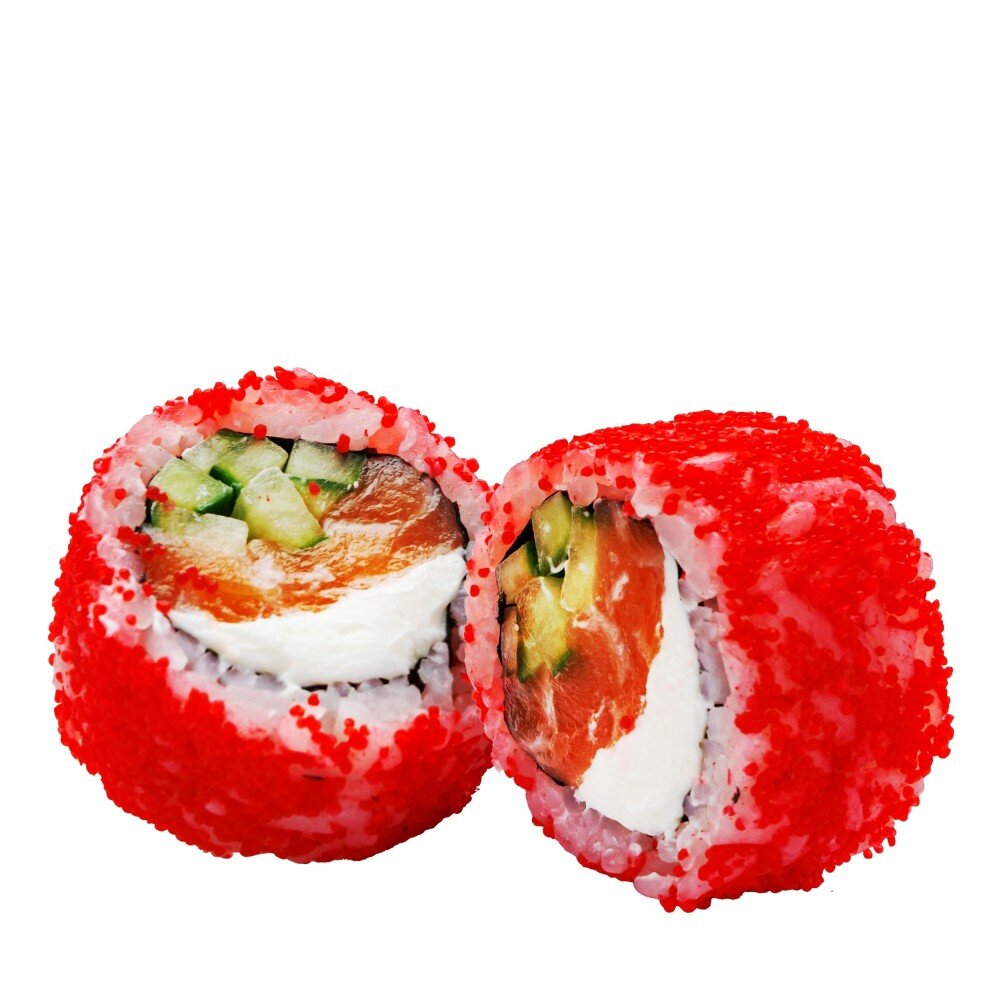 8 шт. Состав: рис, нори, творожный сыр, слабосоленый лосось, огурец, икра масаго, кунжут Имбирь, васаби и соевый соус включены в стоимость.