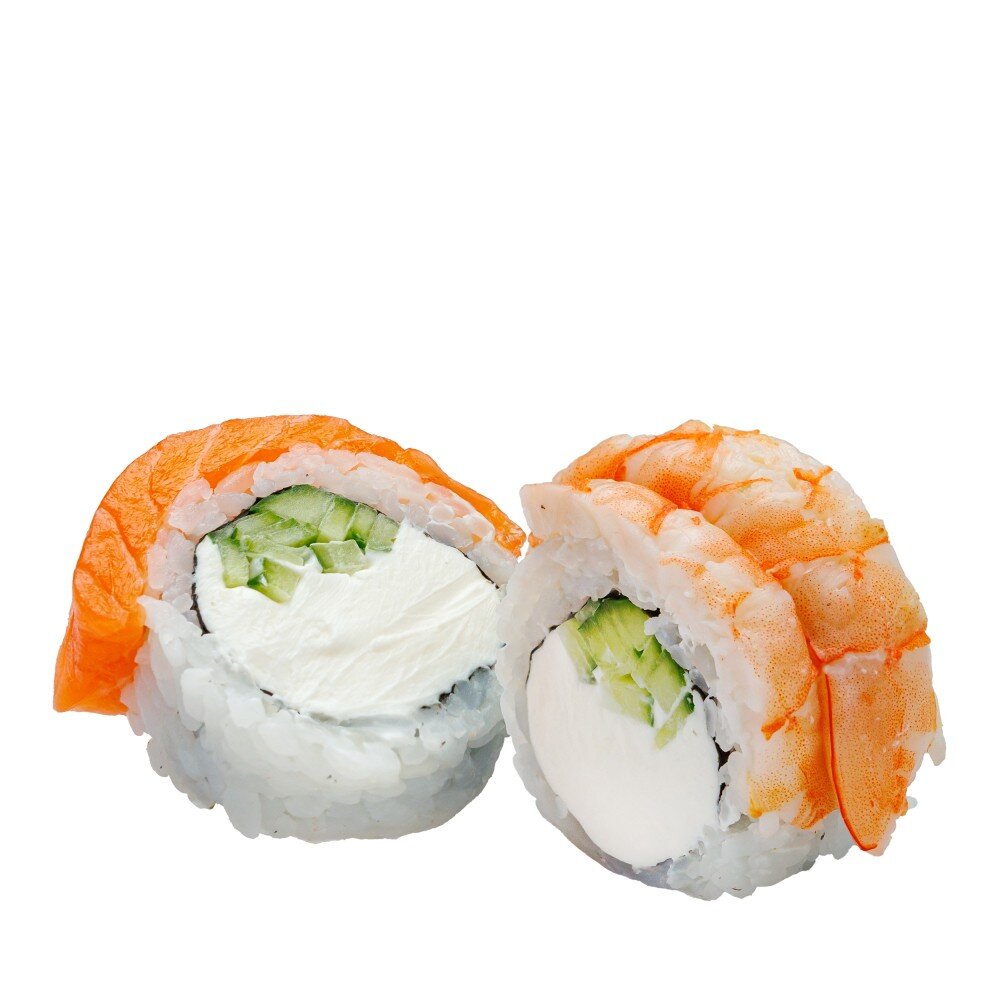 8 шт. Состав: рис, нори, творожный сыр, лосось, креветки тигровые, огурец. Имбирь, васаби и соевый соус включены в стоимость.