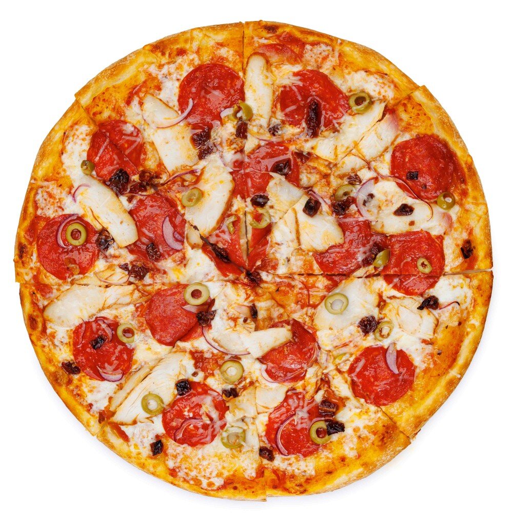Состав: тесто дрожжевое, соус томатный, моцарелла, куриное филе, пепперони, оливки, вяленые томаты, лук красный