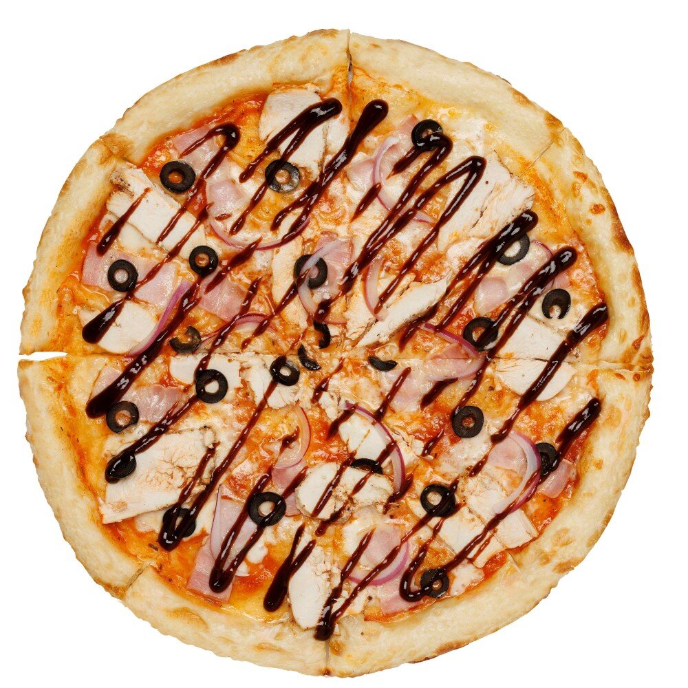 Состав: тесто дрожжевое, соус томатный, моцарелла, филе куриное, бекон, маслины, лук красный, соус барбекю.