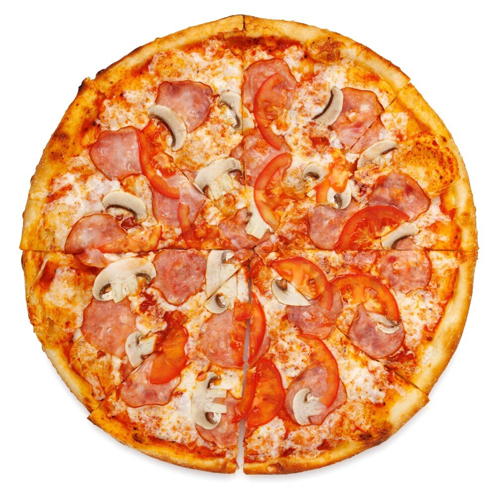 Состав: тесто дрожжевое, соус томатный, моцарелла, ветчина, шампиньоны, помидоры