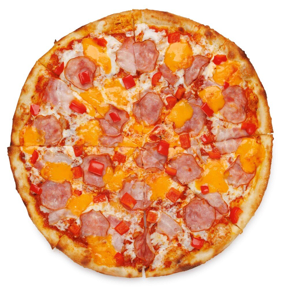 Состав: тесто дрожжевое, соус томатный, моцарелла, бекон, ветчина, сыр чеддер, перец болгарский