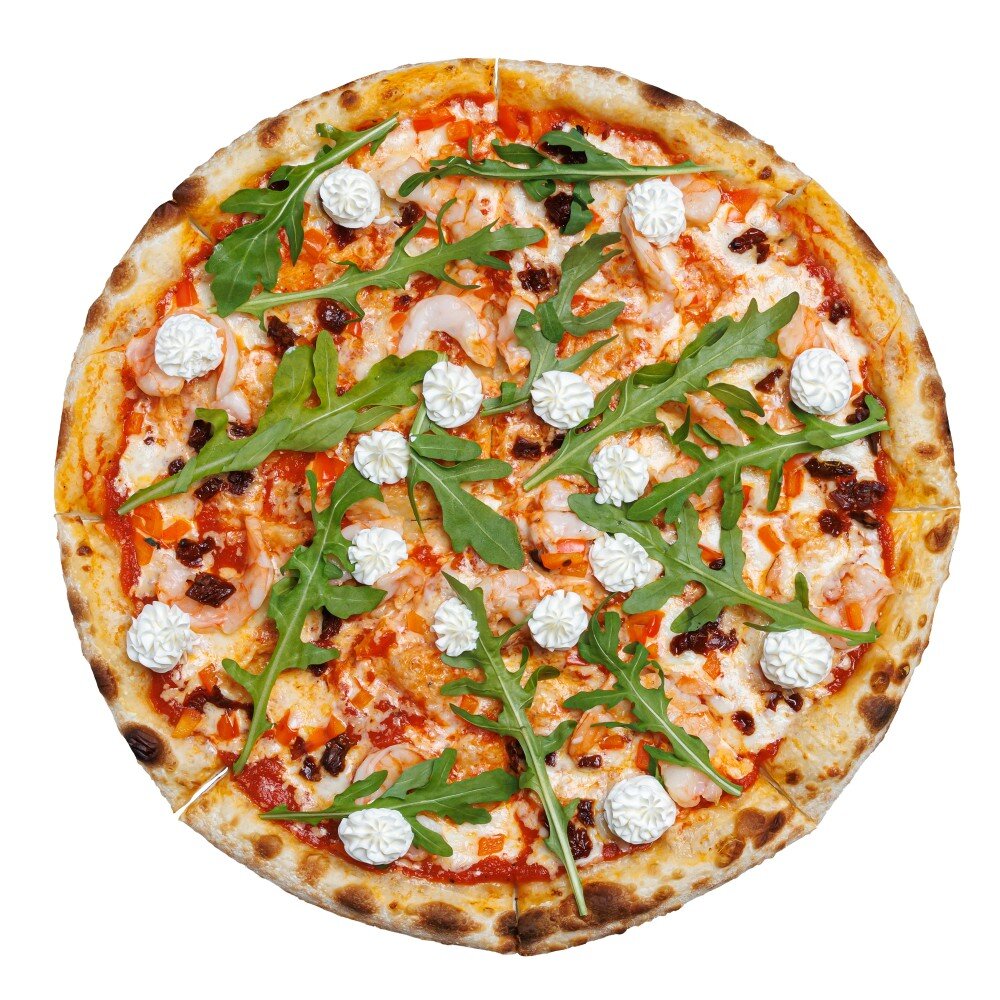 Состав: тесто дрожжевое, соус томатный, моцарелла, креветки тигровые, сыр творожный, перец болгарский, вяленые томаты, руккола.