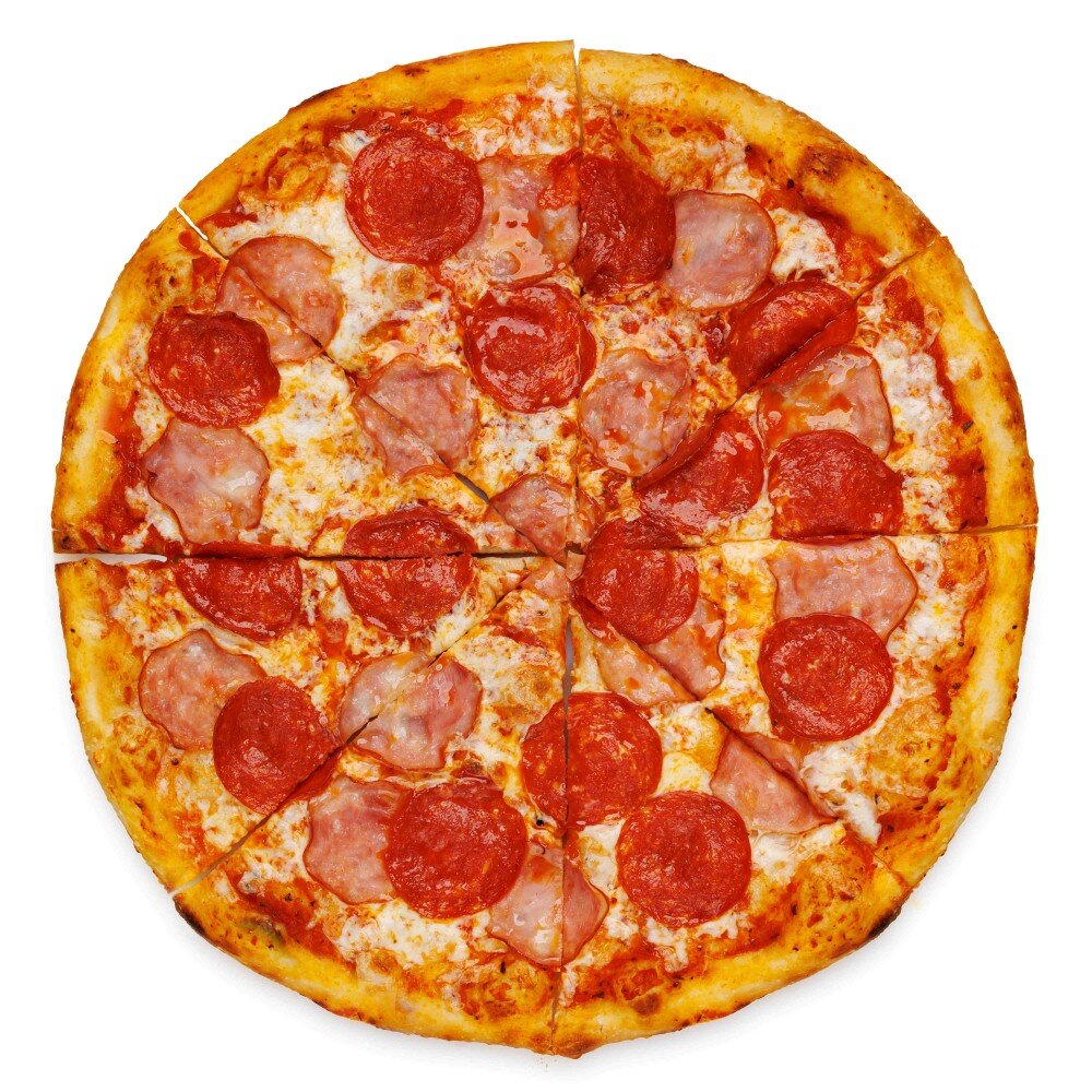 Состав: тесто дрожжевое, соус томатный, моцарелла, ветчина, пепперони