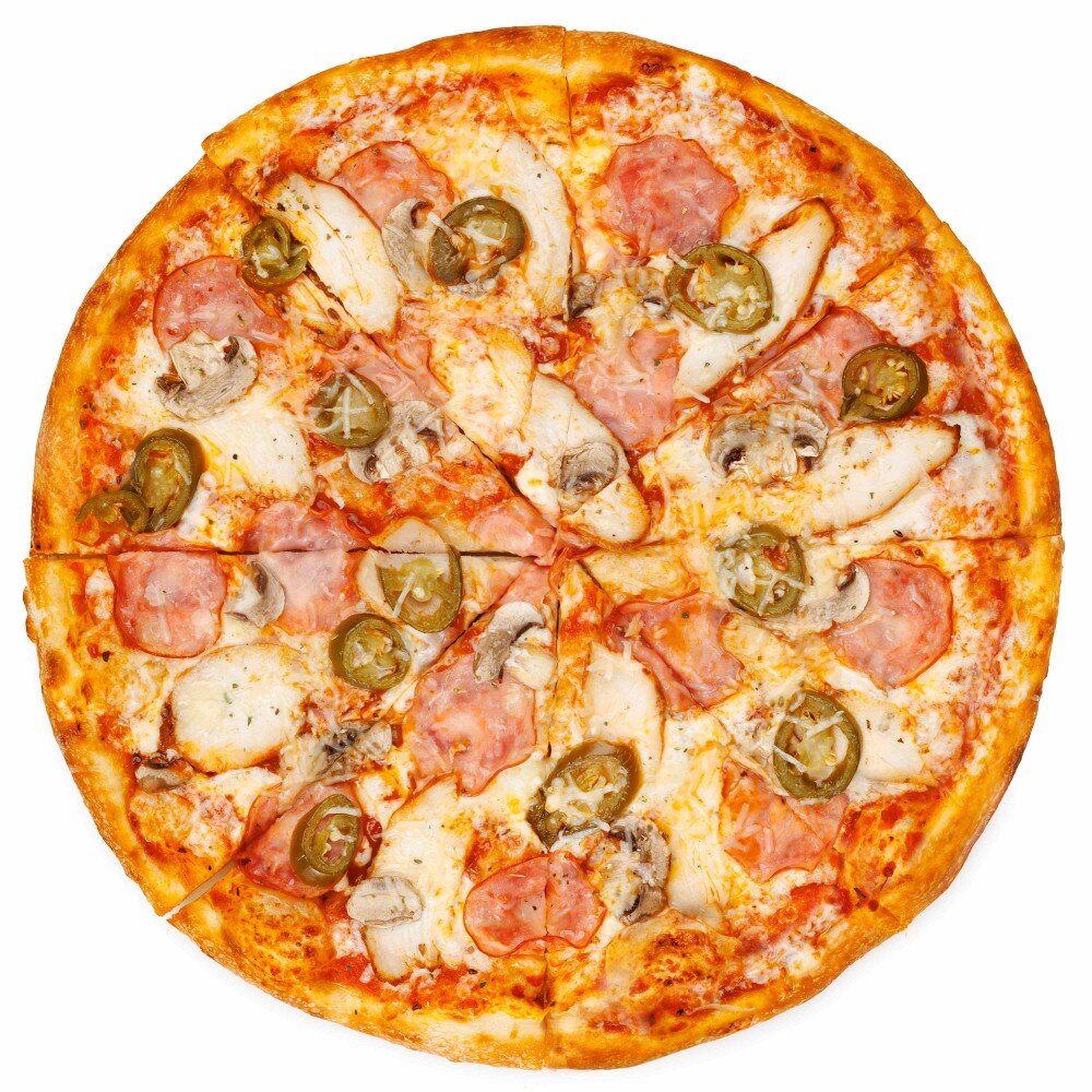 Состав: тесто дрожжевое, соус томатный, моцарелла, филе куриное, ветчина, халапеньо, шампиньоны, пармезан
