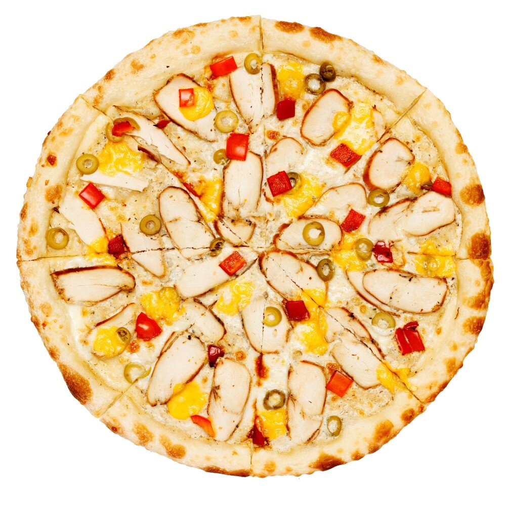 Состав: тесто дрожжевое, соус "белые грибы", моцарелла, копченое куриное филе, оливки, перец болгарский, сыр чеддер.
