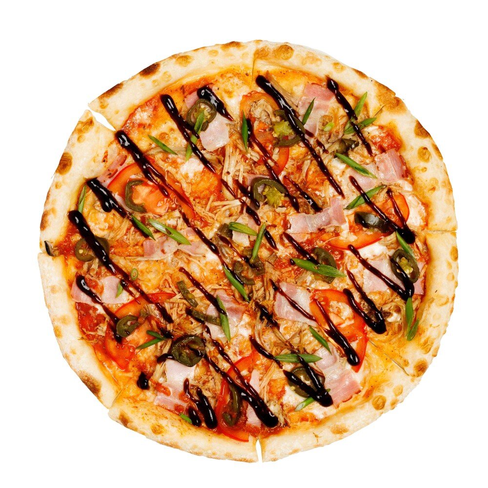 Состав: тесто дрожжевое, соус томатный, моцарелла, свинина, бекон, помидоры, халапеньо, маслины, соус барбекю, лук зеленый