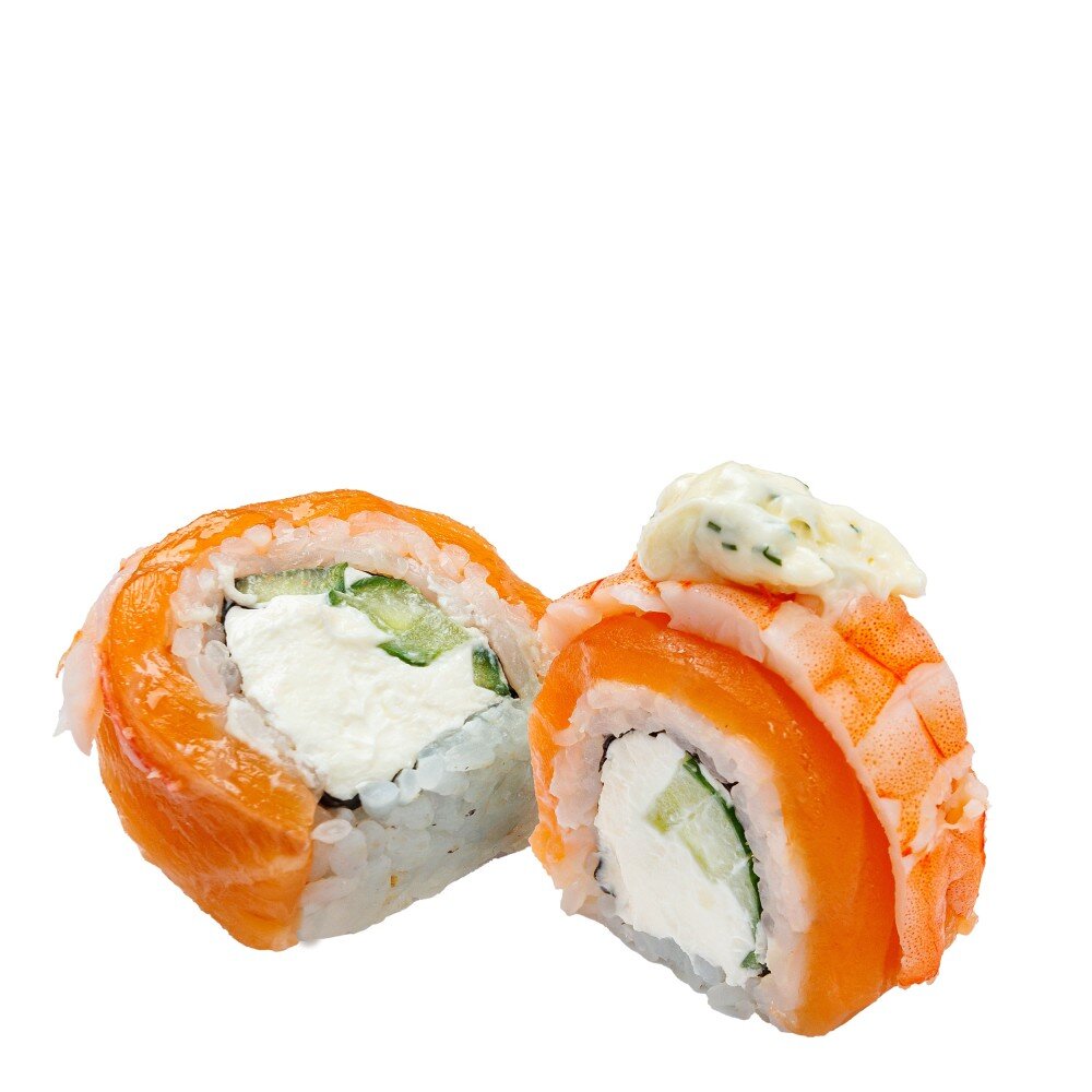 Состав: рис, нори, лосось, творожный сыр, огурец, креветки тигровые, соус чесночный. Имбирь, васаби и соевый соус включены в стоимость.