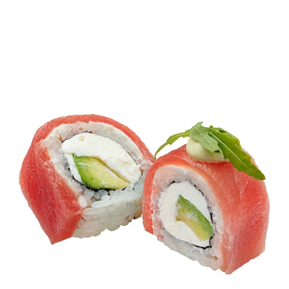Состав: рис, нори, тунец, творожный сыр, авокадо, соус вассаби, микрозелень. Имбирь, васаби и соевый соус включены в стоимость.