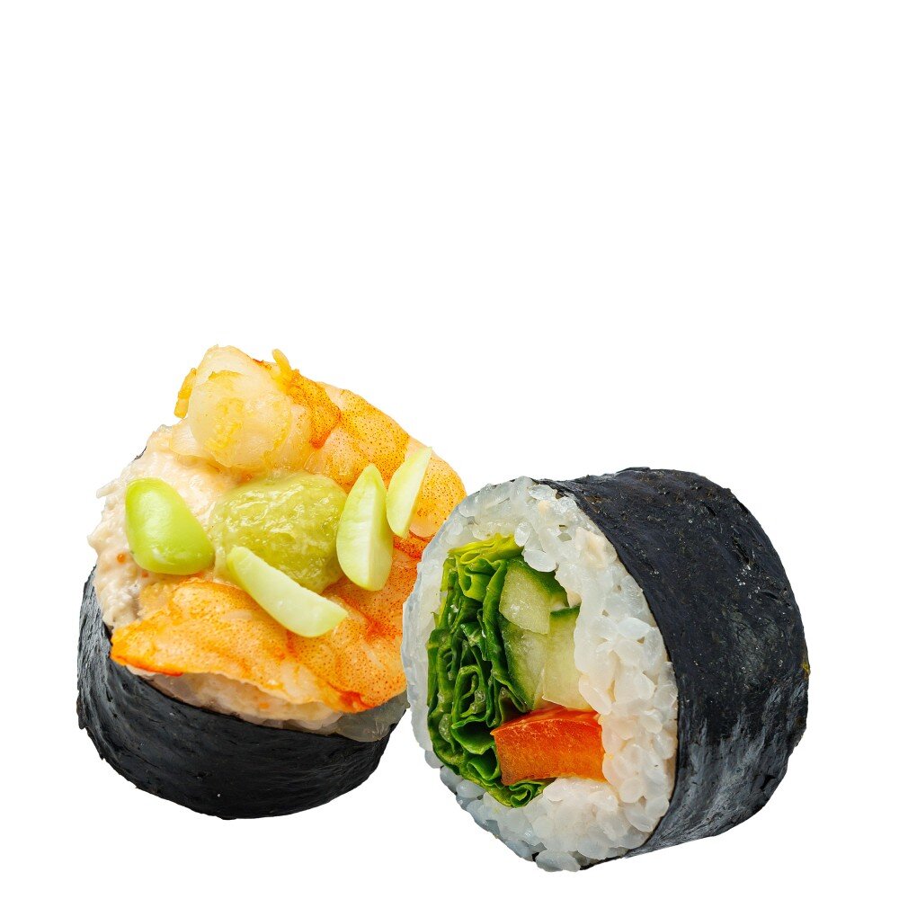 Состав: рис, нори, креветки тигровые, огурец, салат романо, перец болгарский, соус имбирный, соус васаби, эдамаме. Имбирь, васаби и соевый соус включены в стоимость.