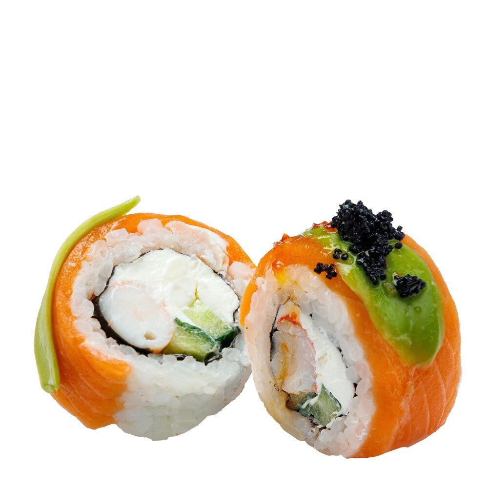 Состав: рис, нори, лосось, креветки тигровые, сыр творожный, огурец, авокадо, икра масаго, соус сладкий чили. Имбирь, васаби и соевый соус включены в стоимость.