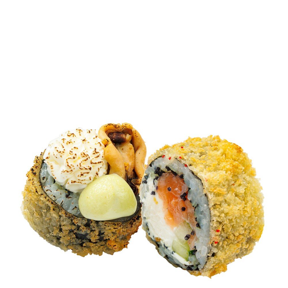 Состав: рис, нори, слабосоленый лосось, творожный сыр, мидии, огурец, икра масаго, соус васаби, панировка панко . Имбирь, васаби и соевый соус включены в стоимость.