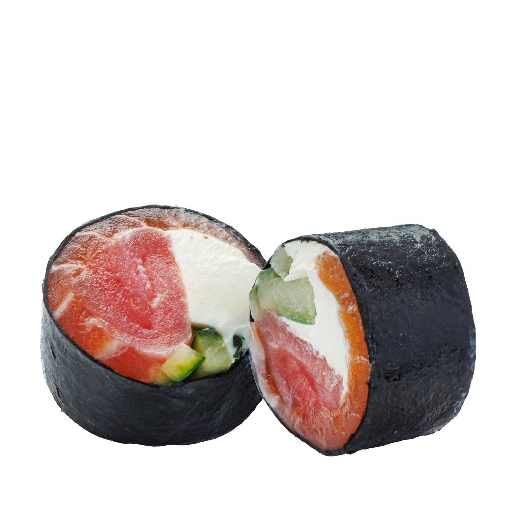 8 шт. Состав: нори, лосось, тунец, сыр творожный, соус терияки, огурец. Имбирь, васаби и соевый соус включены в стоимость.