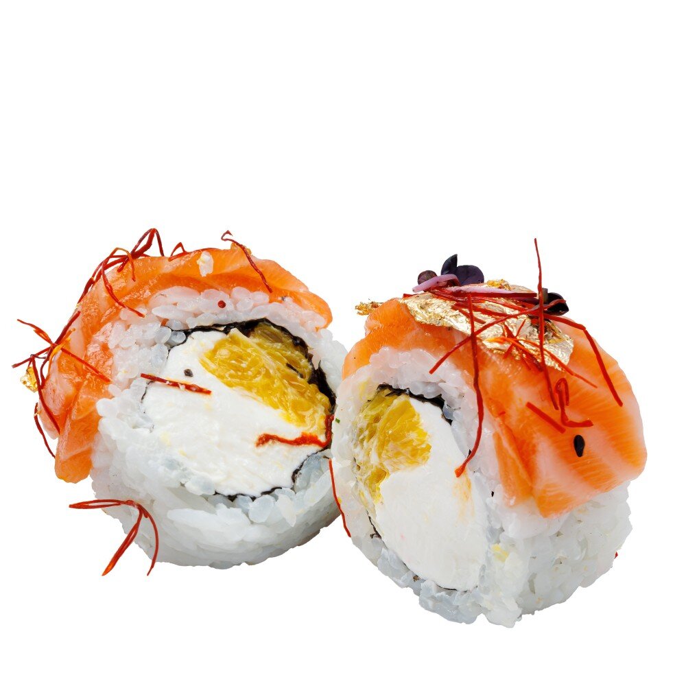 8 шт. Состав: рис, нори, сыр творожный, лосось, апельсин, чили нити, микрозелень, золото пищевое. Имбирь, васаби и соевый соус включены в стоимость.