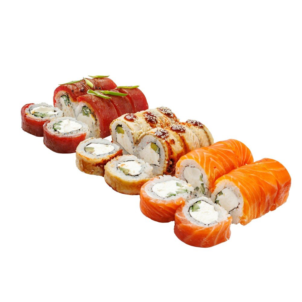 24 шт. Состав: ролл с опаленным тунцом, ролл Канада с угрем, ролл филадельфия люкс. Имбирь, васаби и соевый соус включены в стоимость.