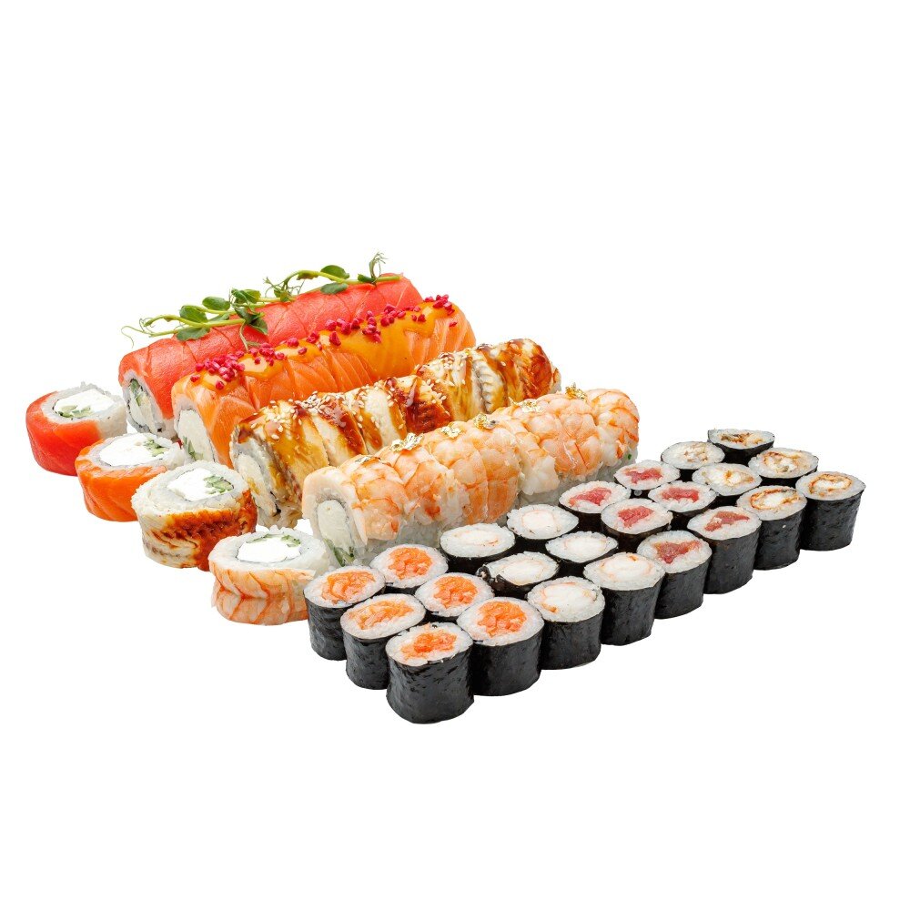 64 шт. Состав: ролл филадельфия с тунцом, ролл филадельфия люкс, ролл Канада с угрем, ролл филадельфия с креветкой, маки с креветкой, маки с лососем, маки с угрем, маки с тунцом.