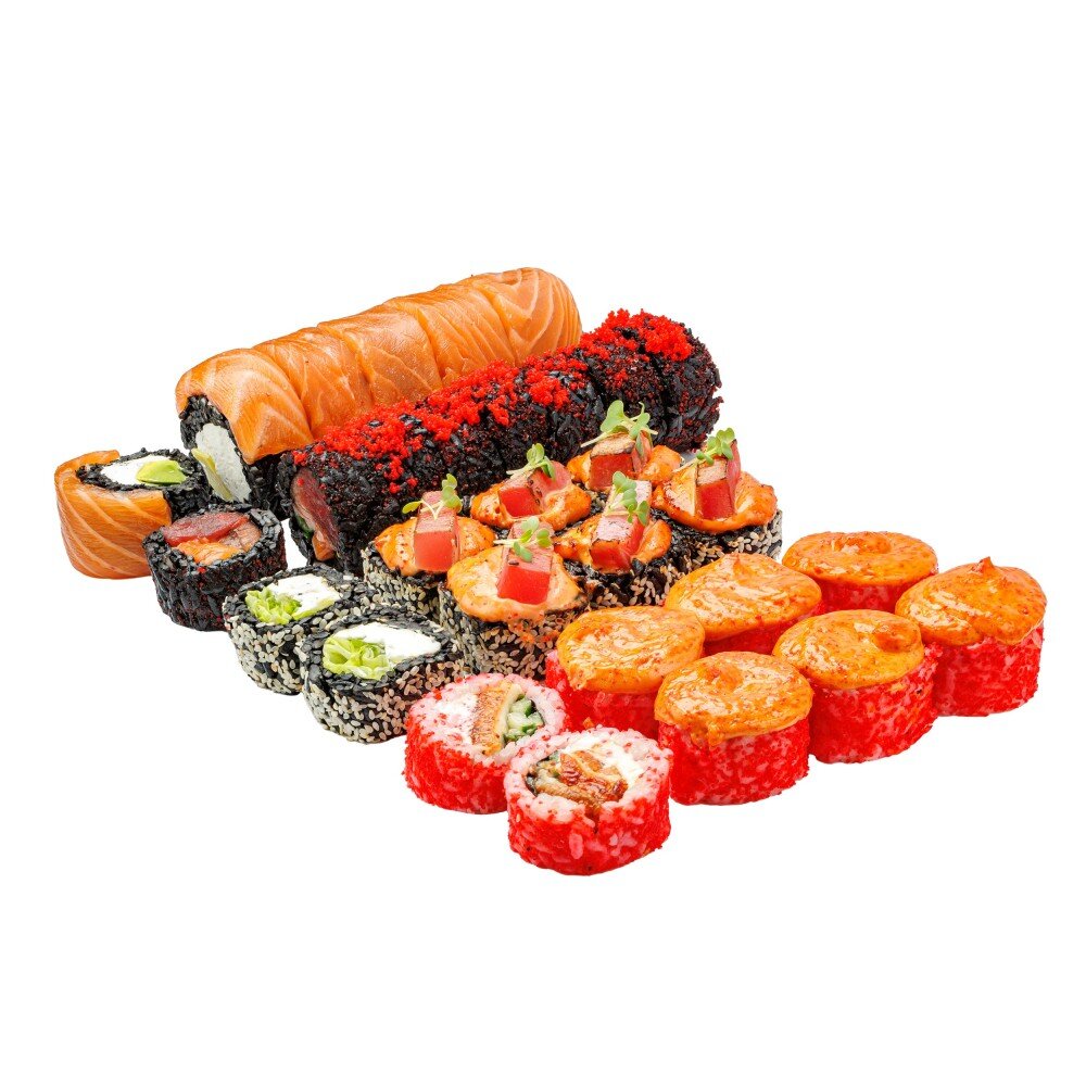 32 шт. Состав: ролл филадельфия блэк, блэк ролл с лососем и тунцом, ролл спайси с тунцом, ролл запеченный с угрем. Имбирь, васаби и соевый соус включены в стоимость.