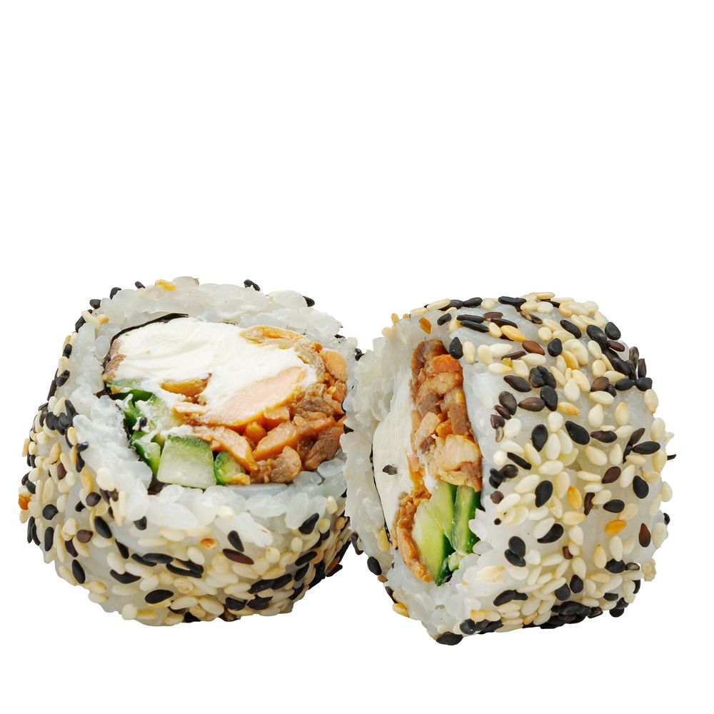 8 шт. Состав: рис, нори, сыр творожный, лосось, соус терияки, огурец, кунжут черный, кунжут белый. Имбирь, васаби и соевый соус включены в стоимость.